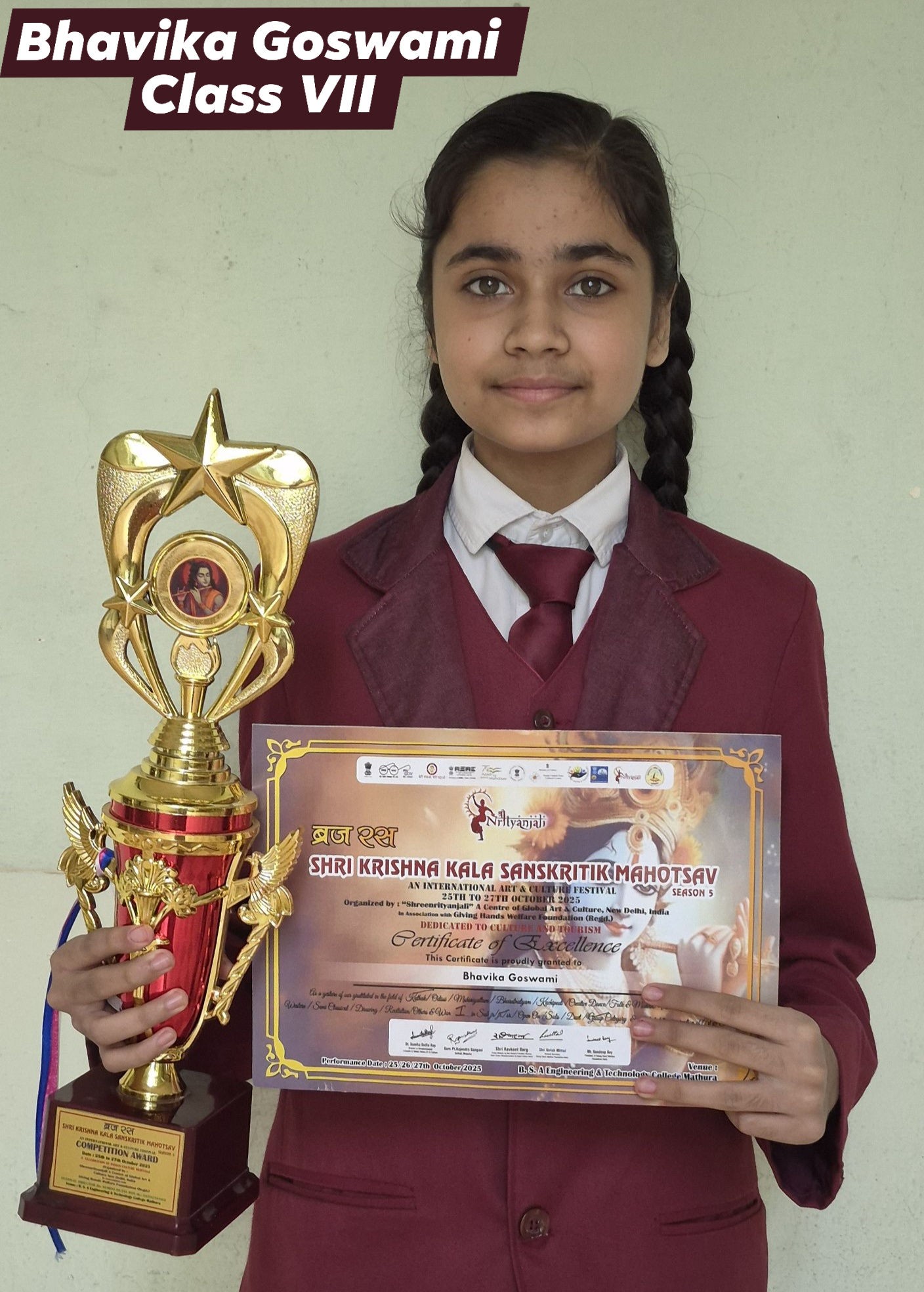 Awarded First Prize in Kathak Solo Dance Competition Braj Ras Shri Krishna Kala Sanskritik Mahotsav Season 5 organised by Shreenrityanjali A Centre of Global Art & Culture, New Delhi in Mathura between Oct 25 to Oct 27, 2025. She was also a part of the Group Dance Winning Team More