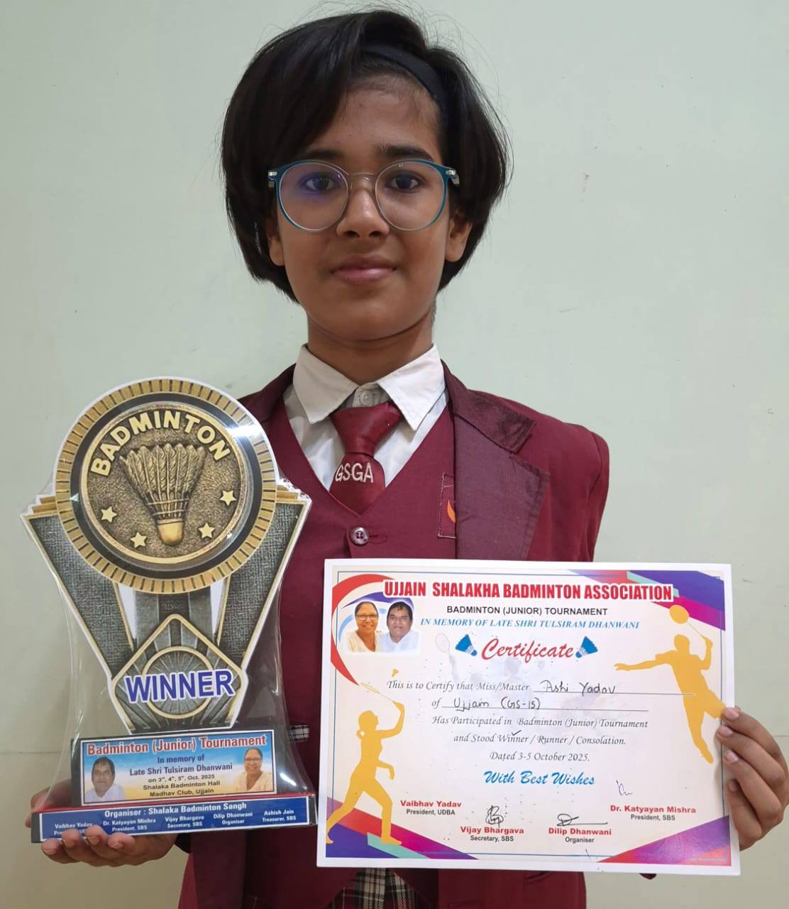 I Prize in Badminton (Junior) Tournament (GS-U15) organized by Ujjain Shalakha Badminton Association Ujjain held between Oct 03 - Oct 05, 2025 More