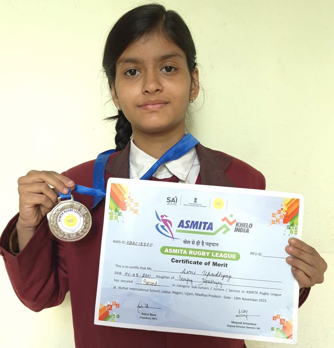 Congratulations...Avani Upadhyay Class IX for being a part of team winning Second Prize in Sub- Juniors Asmita Khelo India Rugby League held on 19.11.2025 in Ujjain. More